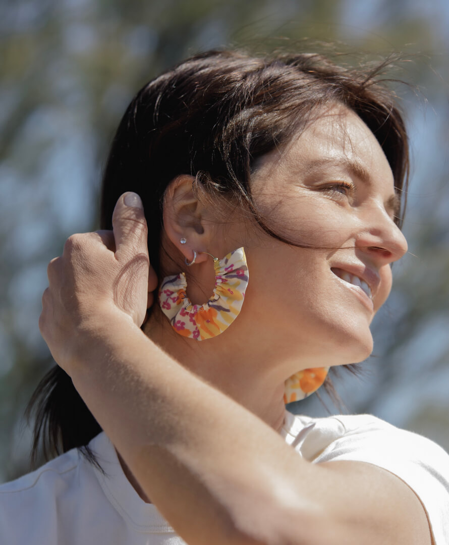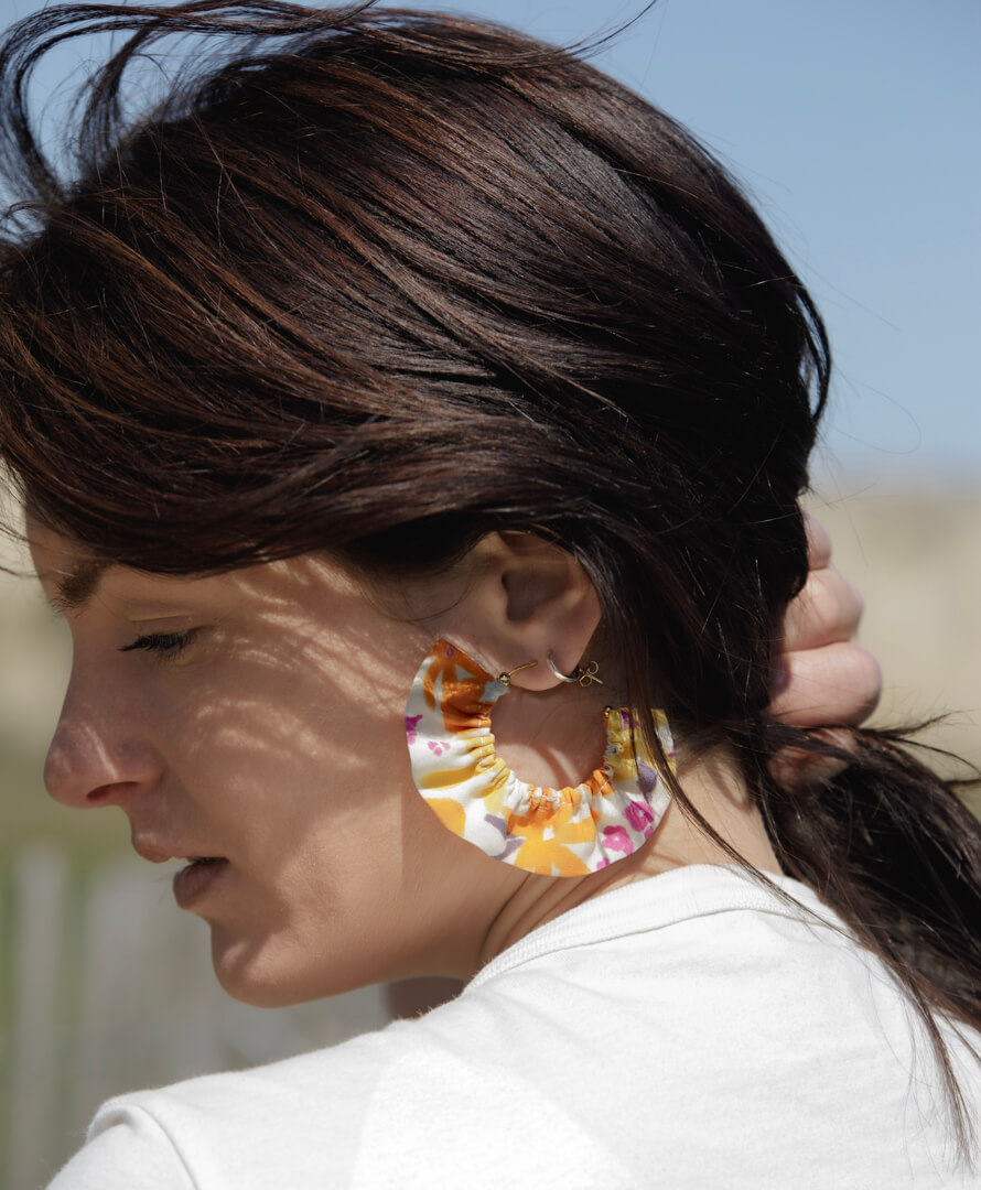 Créoles dorées complétées d’un demi cercle de tissu froncé.