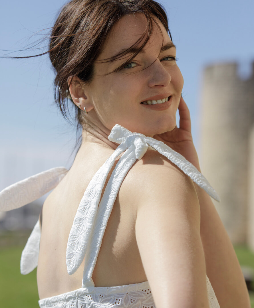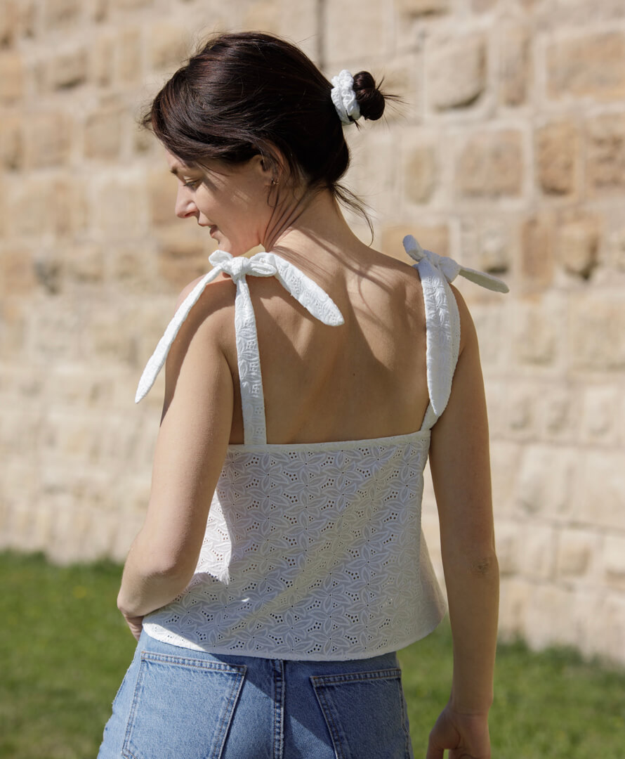 On aime ses noeuds sur les épaules, sa coupe évasée / courte & son magnifique tissu brodé en coton biologique.