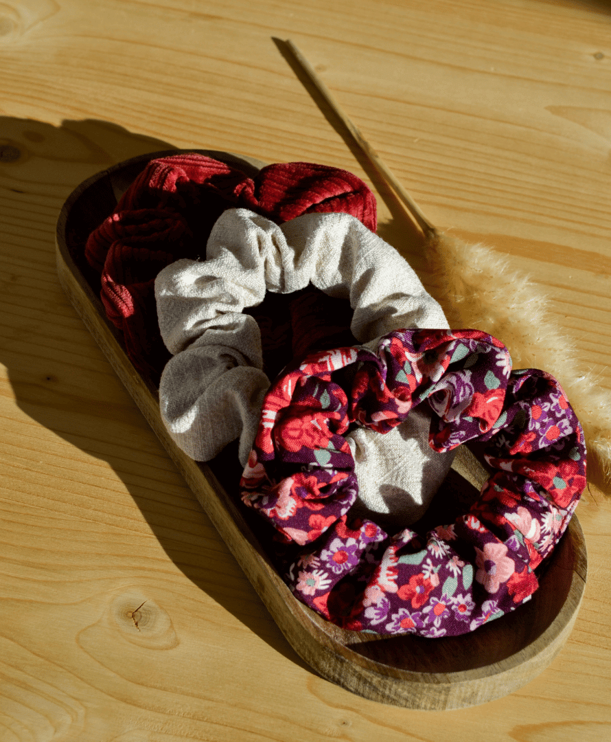 1 chouchou en Viscose Ecovero 1 chouchou en velours upcyclé 100% coton